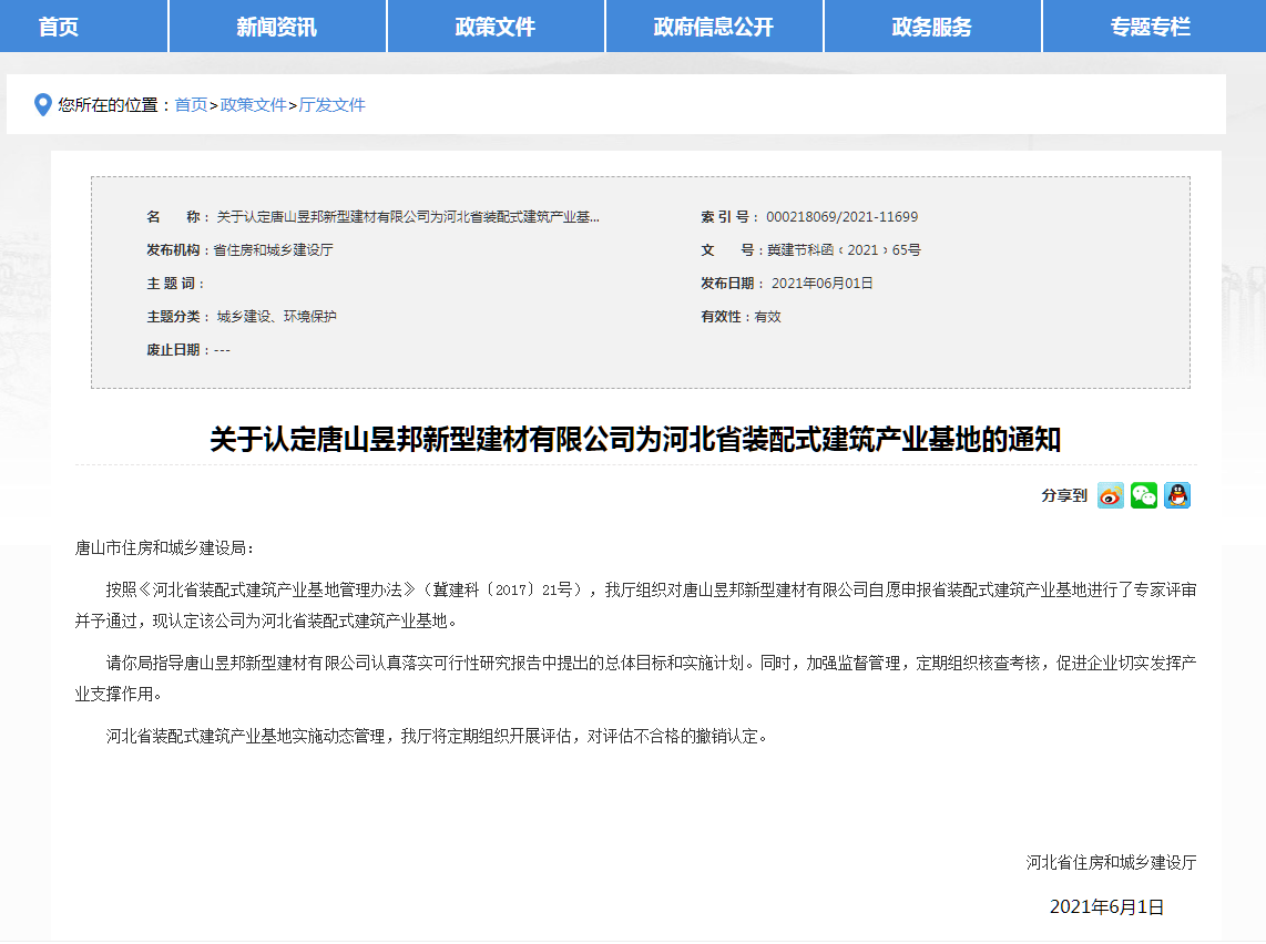 近日,河北省住房和城鄉(xiāng)建設(shè)發(fā)布:《我省新認(rèn)定4處“河北省裝配式建筑產(chǎn)業(yè)基地”》,分別是河北大成建筑設(shè)計咨詢有限公司、中鐵建華北建筑科技有限公司、唐山昱邦新型建材有限公司、河北中冶智群裝配式建筑科技有限公司。