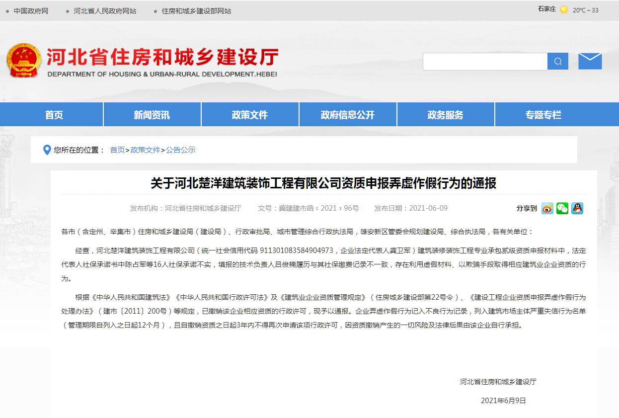 2021年6月9日,河北省住房和城鄉(xiāng)建設(shè)廳發(fā)布《關(guān)于河北楚洋建筑裝飾工程有限公司資質(zhì)申報(bào)弄虛作假行為的通報(bào)》