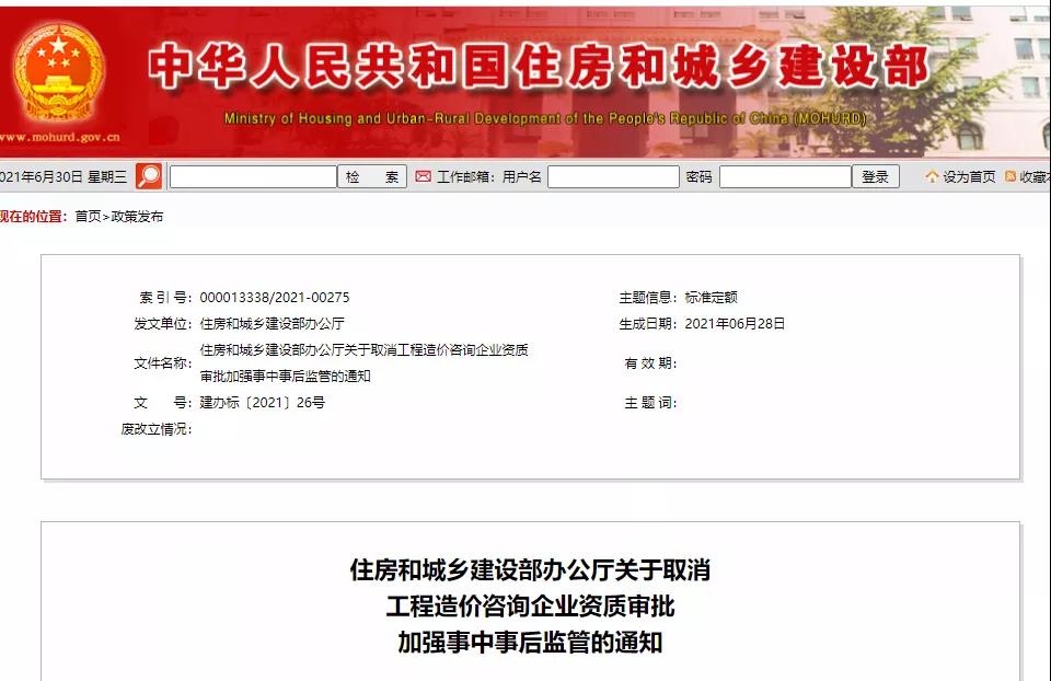 6月29日住建部發(fā)布《關(guān)于取消工程造價咨詢企業(yè)資質(zhì)審批加強事中事后監(jiān)管的通知》:自2021年7月1日起,住房和城鄉(xiāng)建設(shè)主管部門停止工程造價咨詢企業(yè)資質(zhì)審批,工程造價咨詢企業(yè)按照其營業(yè)執(zhí)照經(jīng)營范圍開展業(yè)務(wù),行政機關(guān)、企事業(yè)單位、行業(yè)組織不得要求企業(yè)提供工程造價咨詢企業(yè)資質(zhì)證明。