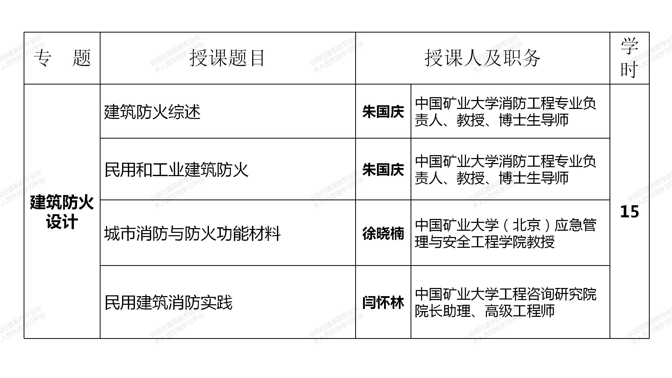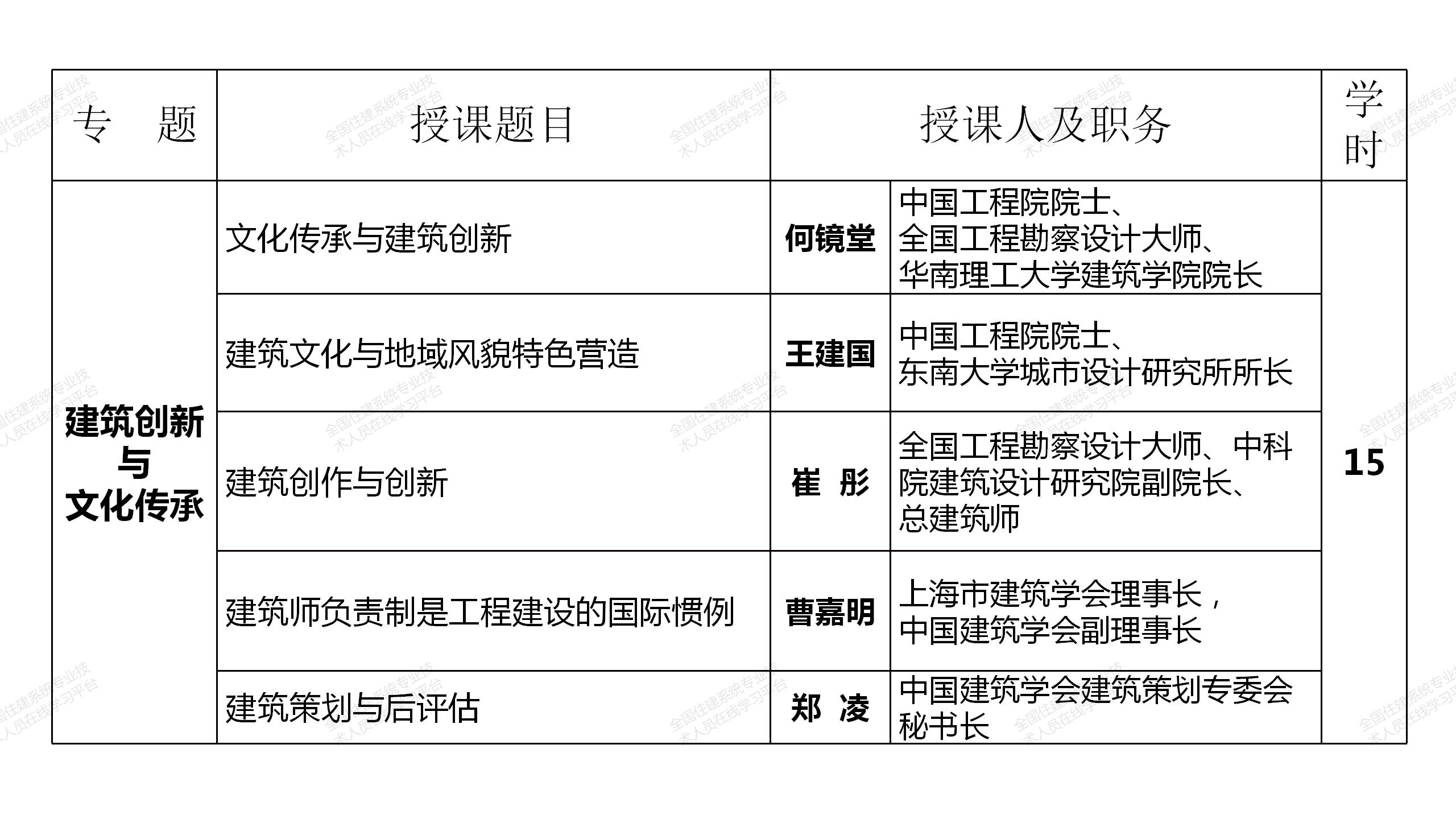 網絡選修課程由中國工程院院士、全國工程勘察設計大師和建筑領域著名專家、住房和城鄉建設部有關領導主講,分政策解讀、城市設計與城市品質提升、建筑創新與文化傳承、綠色建筑與建筑節能、智能建造與建筑工業化和建筑防火設計6個專題共85學時(見附表),注冊建筑師可根據自身需要選擇其中40學時學習,其中10學時的政策解讀專題課程免費提供,并可計入繼續教育學時。課程緊密結合國務院、住房和城鄉建設部近年發布的有關行業改革、裝配式建筑、建筑工業化、智能建造等重大政策,緊跟國家形勢發展需要,是一套集權威性、系統性、針對性、實效性于一體的建筑領域頂尖課程。選修課程于2021年7月12日在“全國住建系統專業技術人員在線學習平臺”(http://www.mayortraining.net)正式上線。