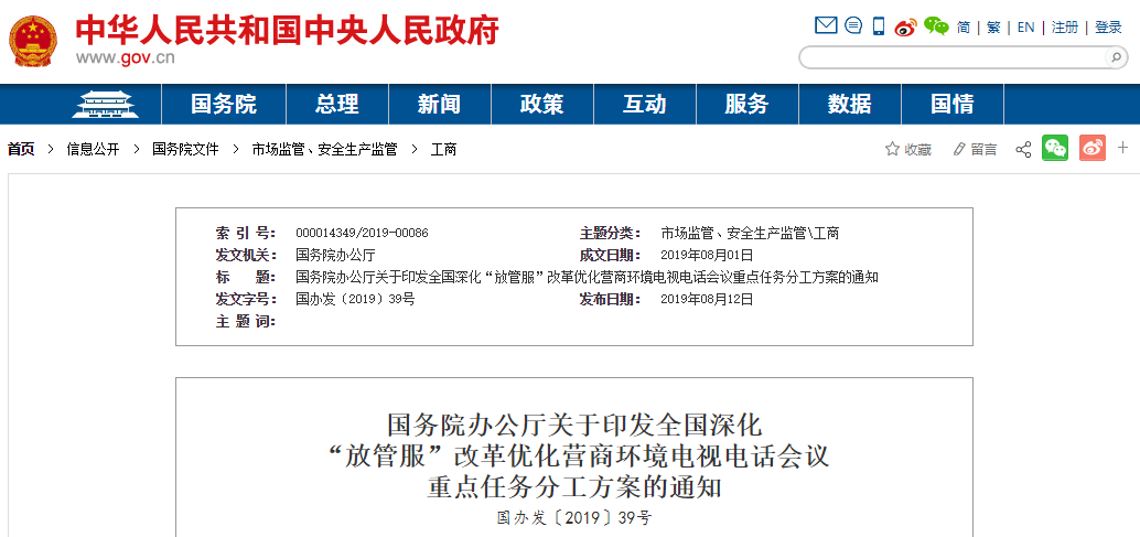 黨中央、國務院高度重視深化“放管服”改革、優化營商環境工作。2019年6月25日,李克強總理在全國深化“放管服”改革優化營商環境電視電話會議上發表重要講話,部署深化“放管服”改革,加快打造市場化法治化國際化營商環境。為確保會議確定的重點任務落到實處,現制定如下分工方案。